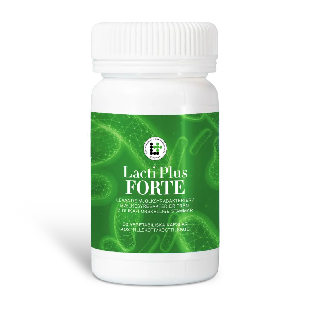 LactiPlus™ FORTE – subalansuotas maisto papildas su 15 mlrd. gyvų pieno rūgšties bakterijų ir bifidobakterijų vienoje kapsulėje. Sudėtyje yra FOS – maistinių skaidulų, padedančių palaikyti bifidobakterijų aktyvumą.