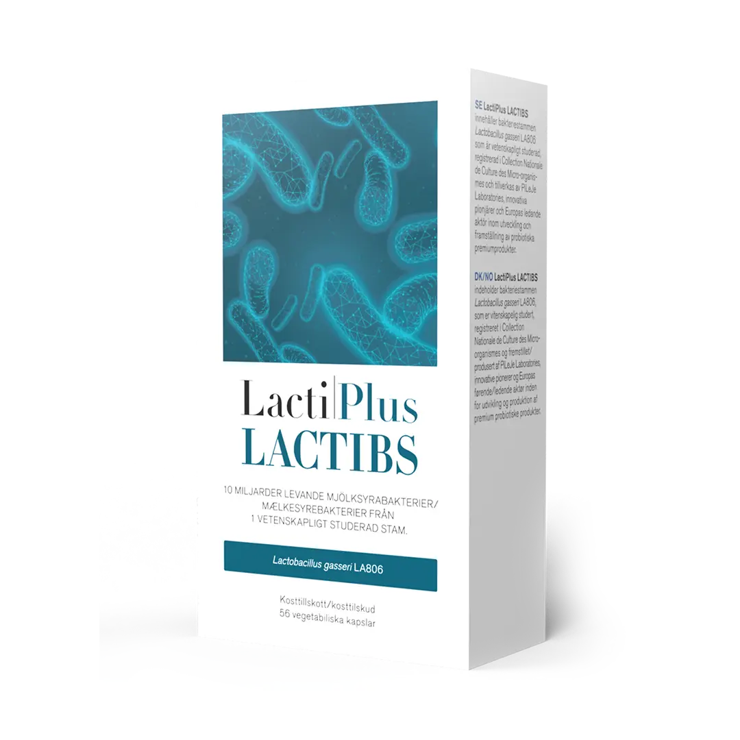 LactiPlus™ LACTIBS – tikslinės paskirties maisto papildas su 10 mlrd. gyvų pieno rūgšties bakterijų iš Lactobacillus gasseri LA806 padermės. Sukurtas vartoti bent keturias savaites žarnyno mikrofloros balansui palaikyti.